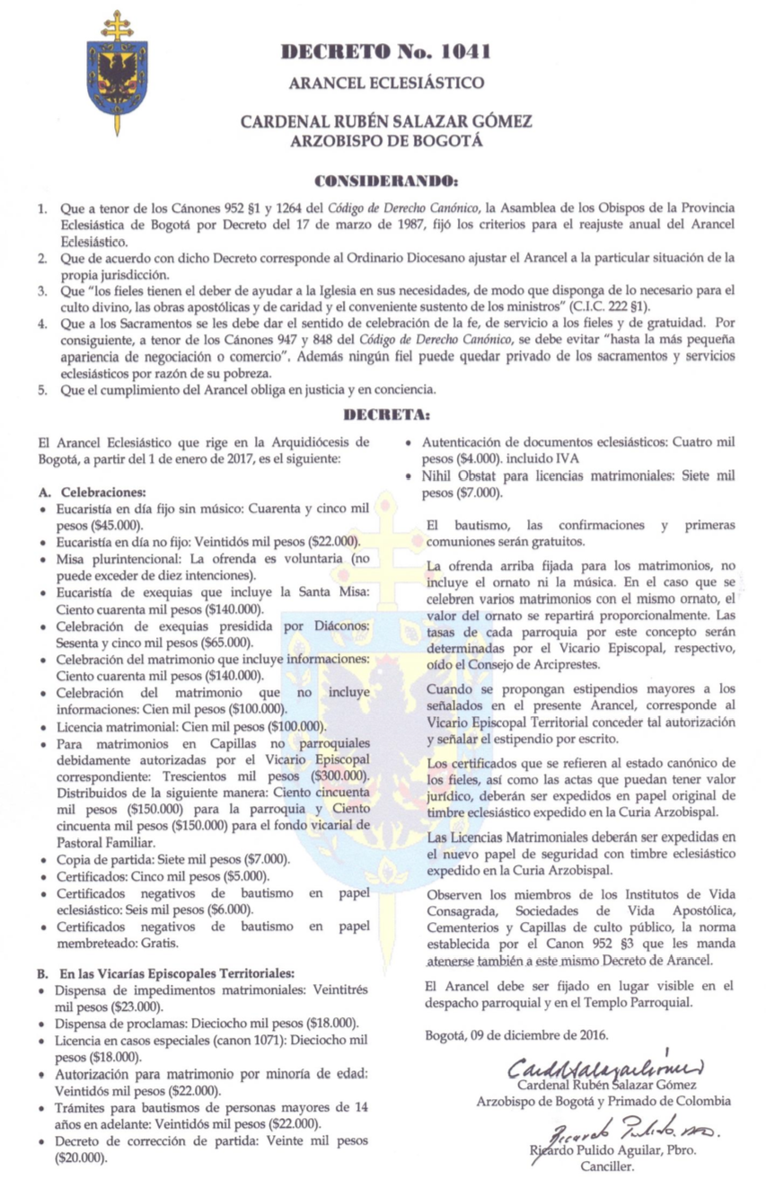 El señor cardenal Rubén Salazar Gómez ha expedido el decreto anual del Arancel eclesiástico