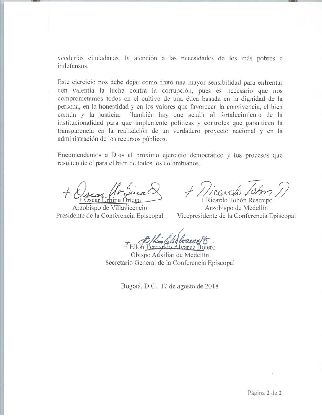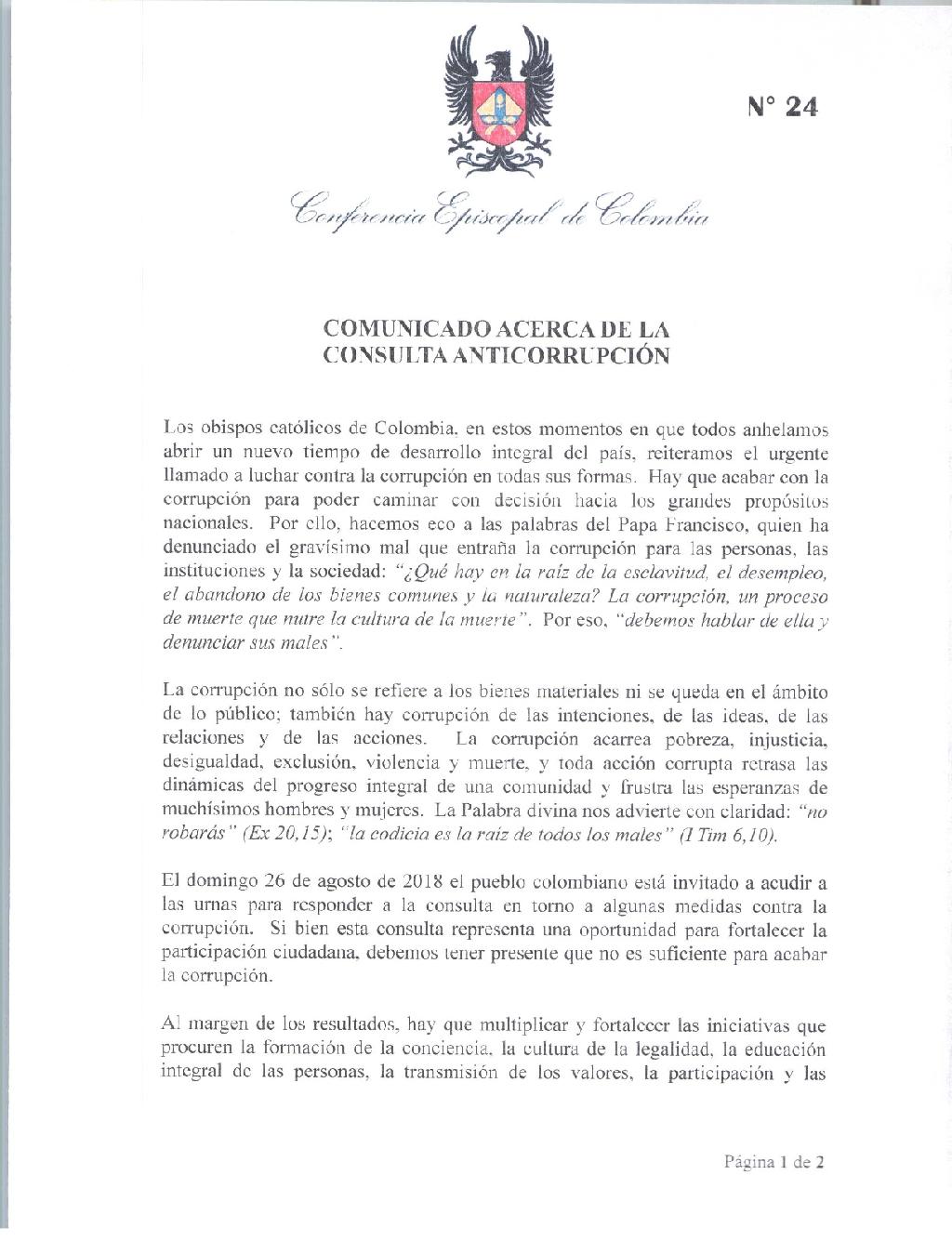 Centro de información Yo quiero Noticias Boletines Eventos Artículos Canonización Mensajes del Señor Cardenal Cartas pastorales Homilías Mensajes La voz del pastor Documentos del Vaticano NoticiasIglesia católica anima a luchar contra la corrupción22 de Agosto de 2018Los obispos católicos del país hacen un llamado a todos los colombianos a luchar contra la corrupción en todas sus formas. Así lo manifestaron, a través de un comunicado… Imagen: https://mioriente.com/ Like 0 Dislike 0 Noticias relacionadas Ordenaciones en la Catedral Primada de Colombia Tiempo de preparación para la Navidad Video del papa - noviembre de 2025