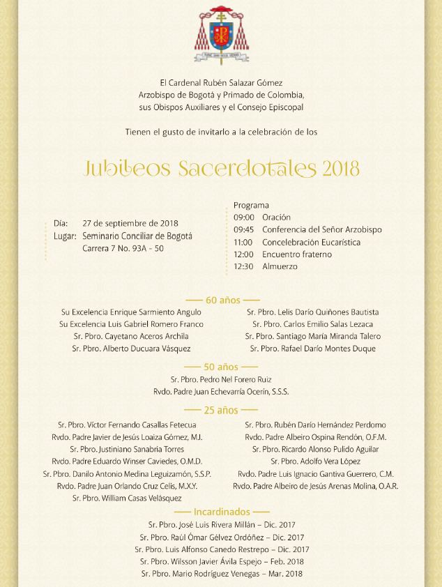Centro de información Yo quiero Noticias Boletines Eventos Artículos Canonización Mensajes del Señor Cardenal Cartas pastorales Homilías Mensajes La voz del pastor Documentos del Vaticano NoticiasJubileos Sacerdotales 201825 de Septiembre de 2018 Like 0 Dislike 0 Noticias relacionadas Ordenaciones en la Catedral Primada de Colombia Tiempo de preparación para la Navidad Video del papa - noviembre de 2025