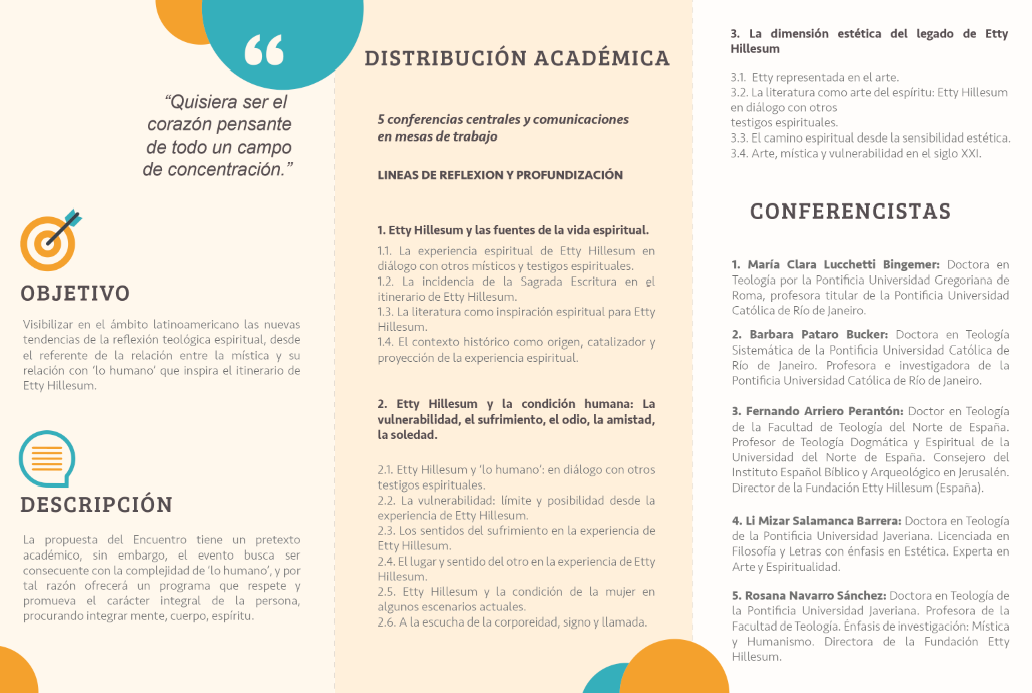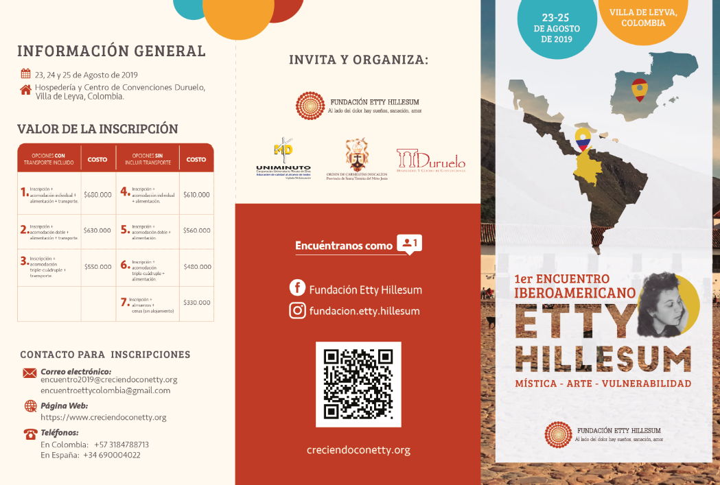 El Primer encuentro Iberoamericano Etty Hillesum, iniciará el viernes 23 de agosto en la mañana y concluirá el domingo 25 de agosto a las 2 de la tarde. Se llevará a cabo en la hermosa población de Villa de Leyva en las instalaciones de la Hospedería Duruelo.