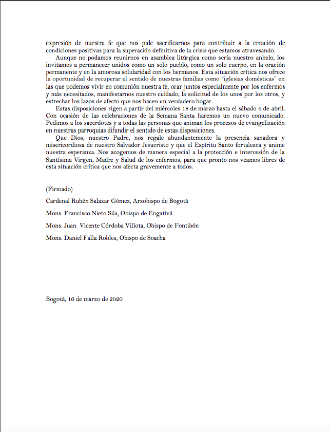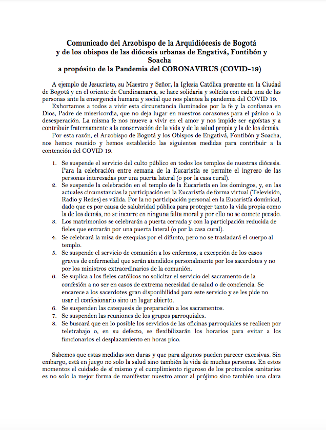 Centro de información Yo quiero Noticias Oraciones Boletines Eventos Artículos Canonización Mensajes del Señor Cardenal Cartas pastorales Homilías Mensajes La voz del pastor Documentos del Vaticano NoticiasSe suspende el servicio del culto público en todos los templos de Bogotá16 de Marzo de 2020Los obispos de las diócesis del territorio metropolitano de Bogotá (Engativá, Soacha y Fontibón) han dado a conocer un comunicado sobre la suspensión del culto público… Like 0 Dislike 0 Noticias relacionadas Ordenaciones en la Catedral Primada de Colombia Tiempo de preparación para la Navidad Video del papa - noviembre de 2025