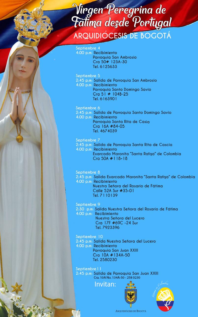 Centro de información Yo quiero Noticias Boletines Eventos Artículos Canonización Mensajes del Señor Cardenal Cartas pastorales Homilías Mensajes La voz del pastor Documentos del Vaticano NoticiasVirgen peregrina de Fátima visita Arquidiócesis de Bogotá5 de Septiembre de 2018La imagen peregrina de Nuestra Señora del Rosario de Fátima que llegó a Colombia desde el pasado 27 de abril y que se encuentra visitando diferentes diócesis del pais,… Like 0 Dislike 0 Noticias relacionadas Ordenaciones en la Catedral Primada de Colombia Tiempo de preparación para la Navidad Video del papa - noviembre de 2025